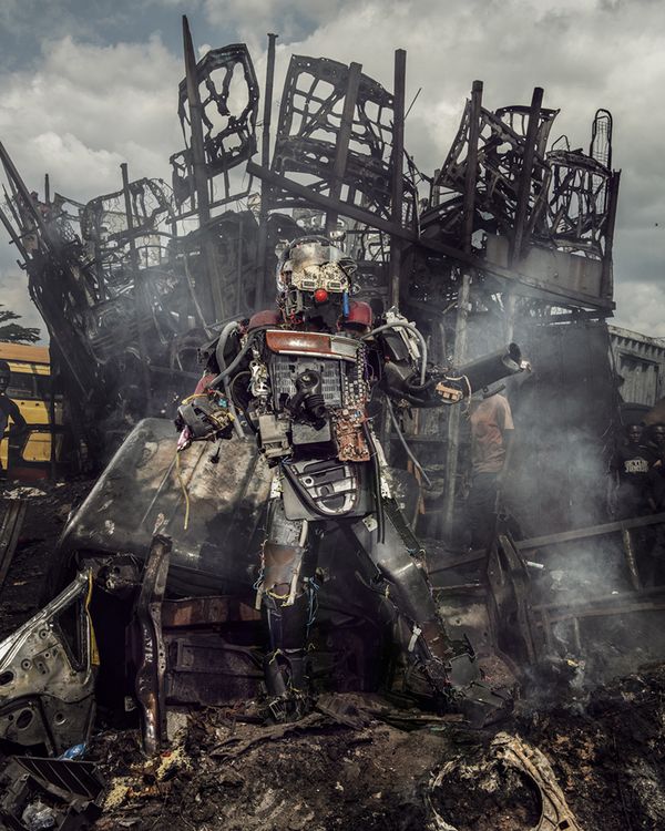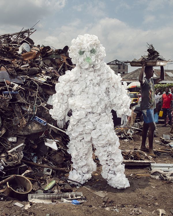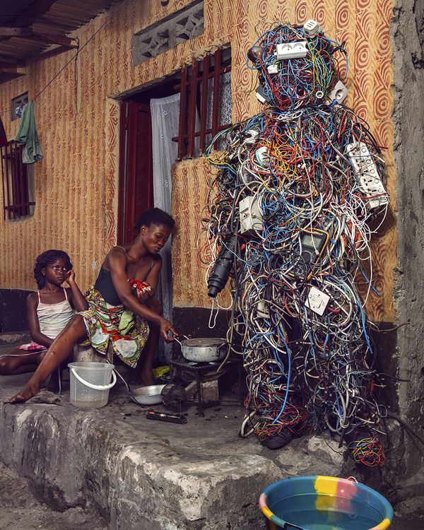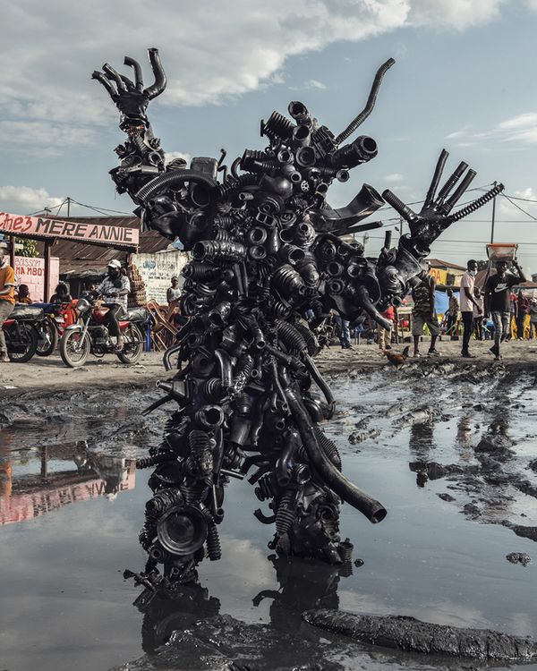 These artists reinvent the traditional African mask with the diversity of waste that surrounds them (plastic, foam, cable, glass, cans).