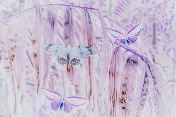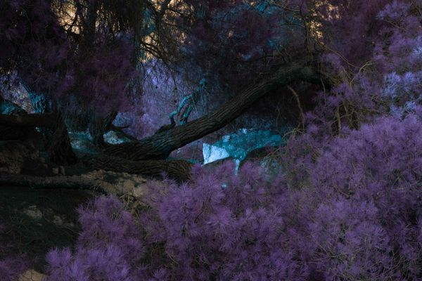 The images present on a subconscious layer are transformed into a visual journey in which visions, flashbacks and hallucinations connect, giving rise to new space-time dimensions and psychedelic worlds. The relationship between landscape and nature is complex: real places have been altered through digital painting interventions and seem to come from alien planets, taking on unusual colours and becoming a mirror of human tension towards the future of the Earth.