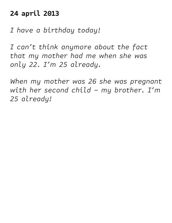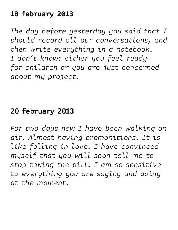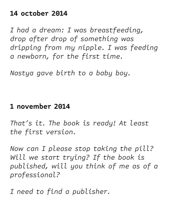 I use my personal diary notes, photos I have taken of other children and (presumably) happy families, archive photos of my and my husband’s parents, audio recordings of my personal conversations with my husband, photos of the walls of our apartment that I continuously decorated with children pictures, etc. The book is constructed as a visual diary of a person whose life is focused on one goal: to have a baby. The idyllic love story (I started dating my husband when I was 18 and married him when I was 20, subsequently moving with him to Switzerland) grows into a more dramatic struggle between the rational arguments of the male and the irrational feelings of the female.
