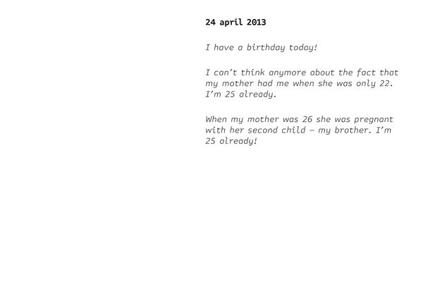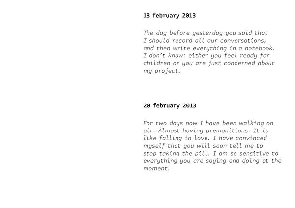 I use my personal notes, photos I have taken of other children and (presumably) happy families, archive photos of my and my husband’s parents, audio recordings of my personal conversations with my husband, photos of the walls of our apartment which I continuously decorated with pictures, photos of half-finished birth control pill packages etc. The project is constructed as a visual diary of a person with an obsession: to have a baby.