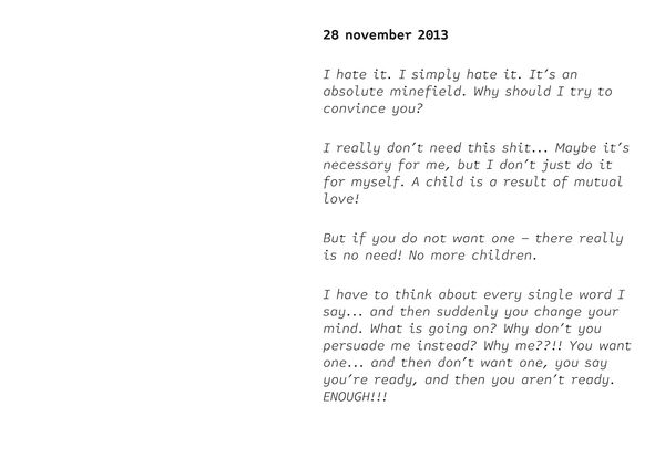 But I want him to be a father. I surround him with pictures of kids. I hang them everywhere. I got old family albums from his parents. I also keep a diary. I record all discussions. I want to put everything in a book. And I will give it to him. And it will convince him.
