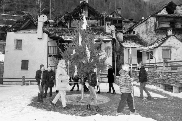 Each year, on February 2, Viganella celebrates Candlemas, the feast marking the return of the sun. It is a moment that intertwines ancient rites — later Christianized — articulated through gestures of blessing and communal sharing. Among these, the most symbolic is the Pescia: a large fir tree raised in the square and adorned with offerings evoking abundance and prosperity (local products, food, and objects prepared especially for the occasion). At the end of the ritual, the branches of the tree are distributed among the inhabitants, who bring them into their homes and barns as a propitiatory sign, wishing for health, fertility, and good harvests in the year to come.