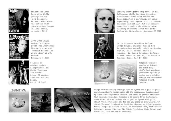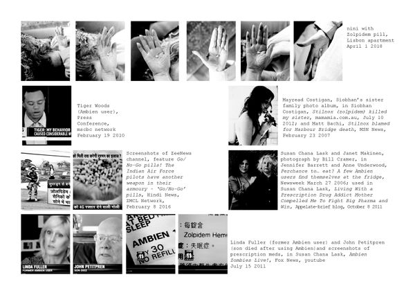 The photos were taken between the Lisbon apartment and the hospital, witnessing the impact of Zolpidol, a prescription sleeping aid, on mum’s physical and psychological condition. Zolpidol is another name for Ambien, a prescription drug whose devastating effects are well documented in countless case courts and press accounts. Whilst I was looking after mum, I immersed myself in research, only to find out that her G.P had made her dependent on the same prescription drug that killed Heath Ledger at 28 and wiped out five years of Eminem’s life when he was in his 30s. The same drug that has transformed so many brilliant individuals into Ambien Zombies as they’re characterised in the press, people with no memories of their actions under the influence.