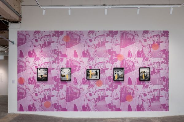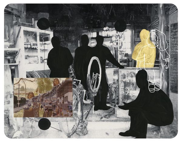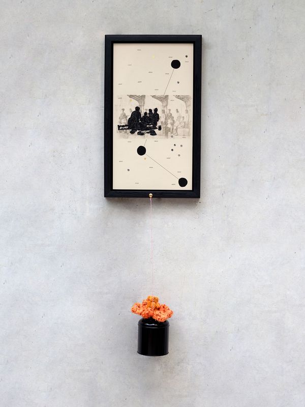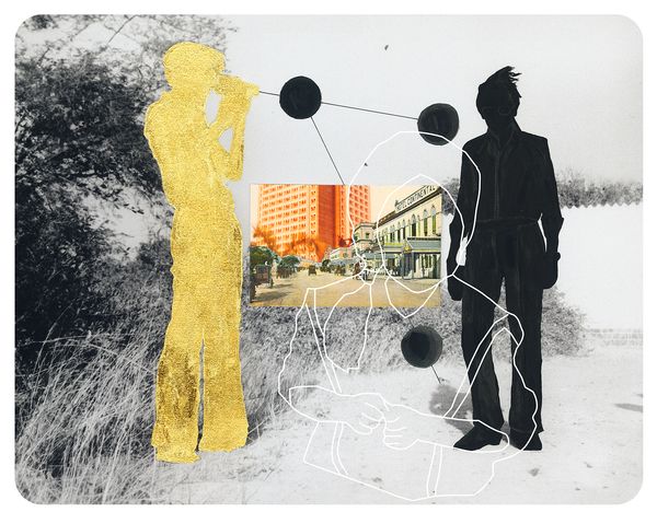 The gestural marks of gouache, ink and the textures of gold leaf; along with collaged elements from cut-out 19th century postcards and archival family photographs, the works are finished with a layer of glass that hold silhouettes of me in my formative years all representing the vastness of stories as well as the voids of lost narratives. By weaving together a multiplicity of histories through images and signs, it provides a language capable of conveying a spectrum of emotions—from pain to joy—and bring to light a narrative of resilience, community, and kinship.