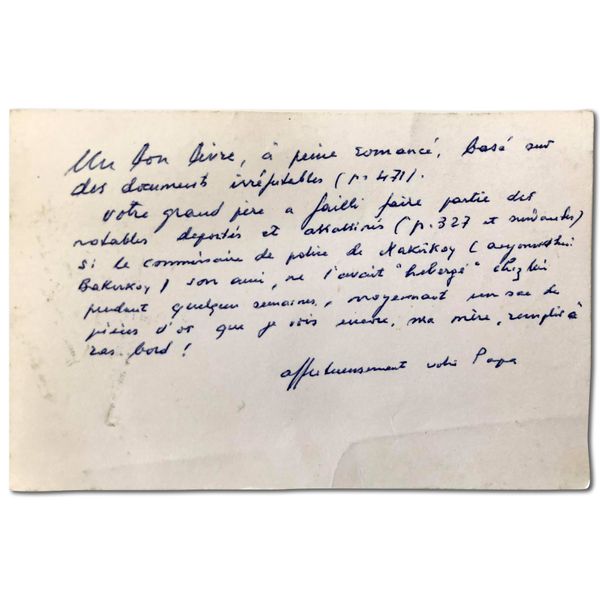 In 1922, my Armenian grandfather, a teenager, immigrated to France on a Nansen passport (stateless passport), fleeing the young Republic of Turkey where new massacres threatened the survivors of the Armenian genocide. Like many others of his generation, he passed on nothing to his children and never spoke of his experiences in Turkey, Constantinople and Talas in Anatolia. The only clue to his past is a note inserted in a novel about the genocide that he gave to his children (“Un poignard dans ce jardin”, Vahé Katcha), in which he reveals how his family survived.