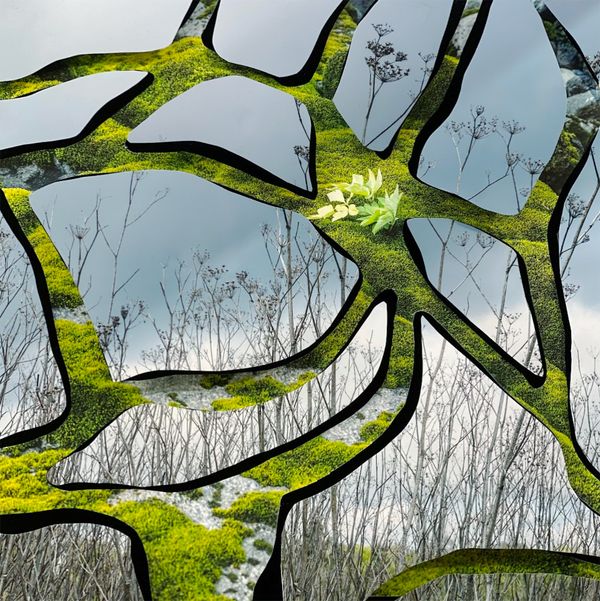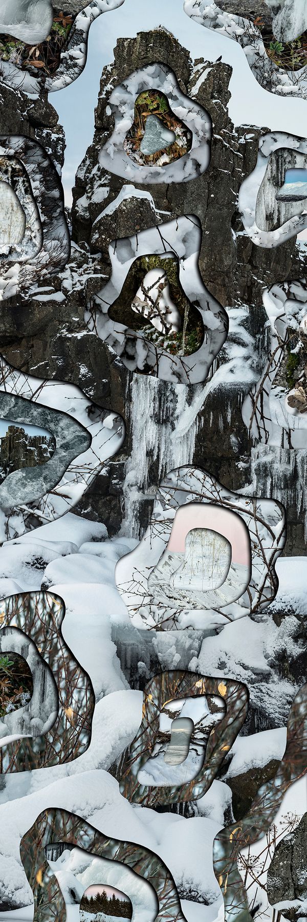 The physical space of landscapes can be closely tied to a person’s identity and sense of being. Infused with personal history, the handmade composite, sculptural landscapes in the series “Imprints” are a re-creation of places and scenes combining photographs taken from my homeland, Iceland, and California where I have resided for the past 20 years. The fragmented photographic cutouts with juxtaposed textures, emphasize the imperfections of memory and the mind’s inability to retain and fully comprehend its environment. Utilizing human biological patterns, the work evokes the intimate connection man has with nature while the discontinuity between the images invites the viewer to draw on their own experiences to complete the work. Including topographical patterns as well as images where parts of the landscape have been erased, the work echoes the erosive effects of time and the loss created by climate change. By incorporating the interplay between man and nature, the images speak to our individual responsibility for our impressions upon our environment.