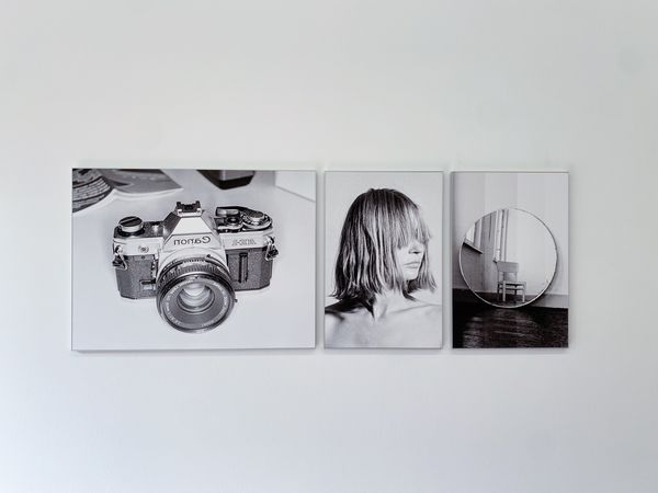 'In Camera' was published by APE as an artist book last year (22x33cm 42 images) with a text by Diane Smyth. 'In Camera' also exists as a changeable room presentation: up to 20 images framed in subtle aluminium frames, printed on mat fine art paper. Mostly 40cm hight, some bigger. Recently a woven image (fabric) Christiaens made in collaboration with her mother was added to the presentation.