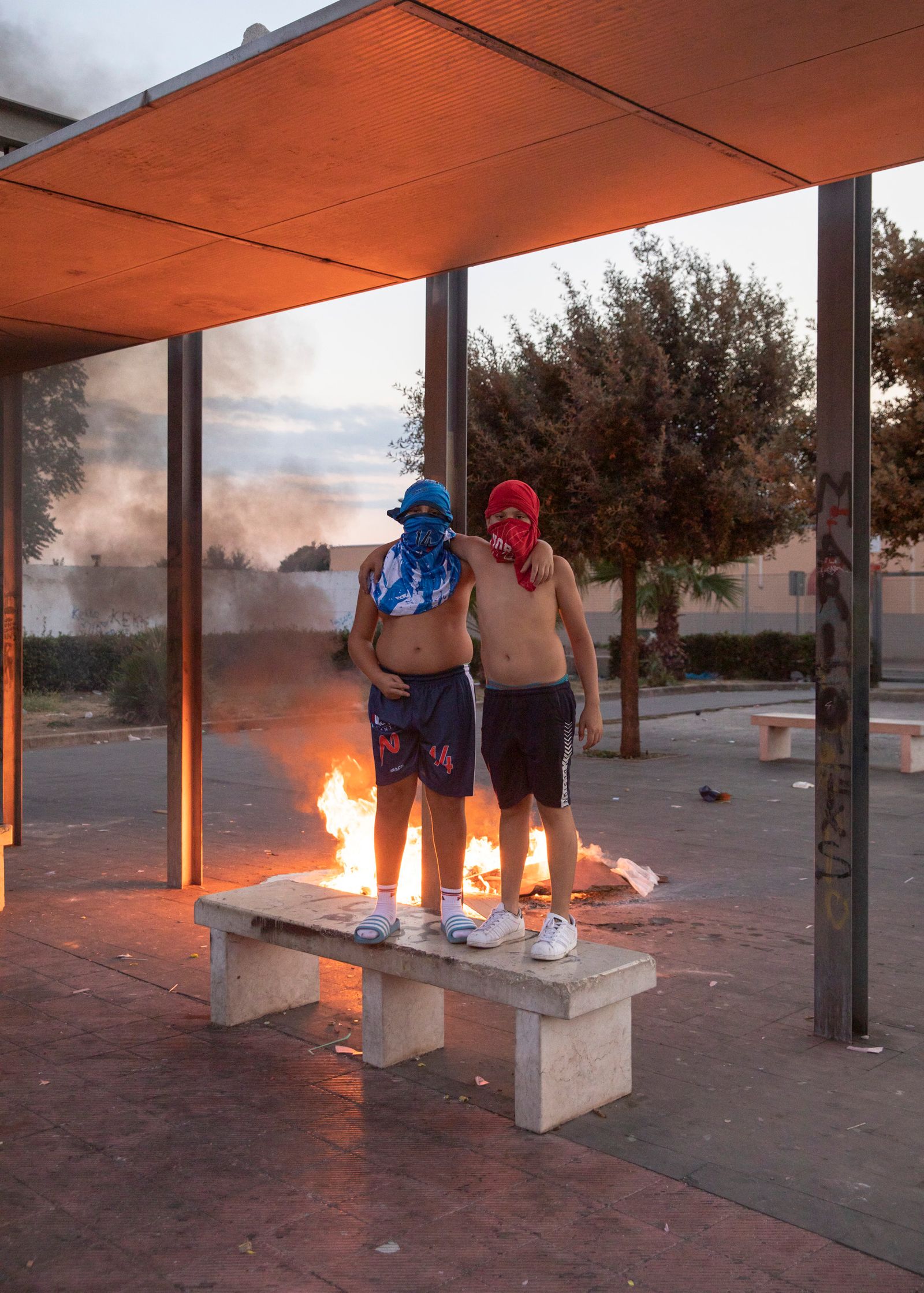 Two boys pose in front of a fire made of burning bulky waste in the Tamburi district. Youth unemployment in Taranto was 44% in 2024, putting the city in 105th place out of 107 in the whole of Italy. Taranto, September 2023