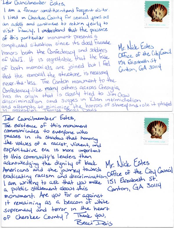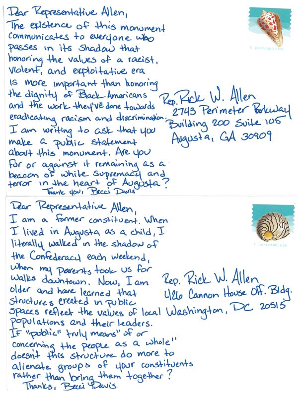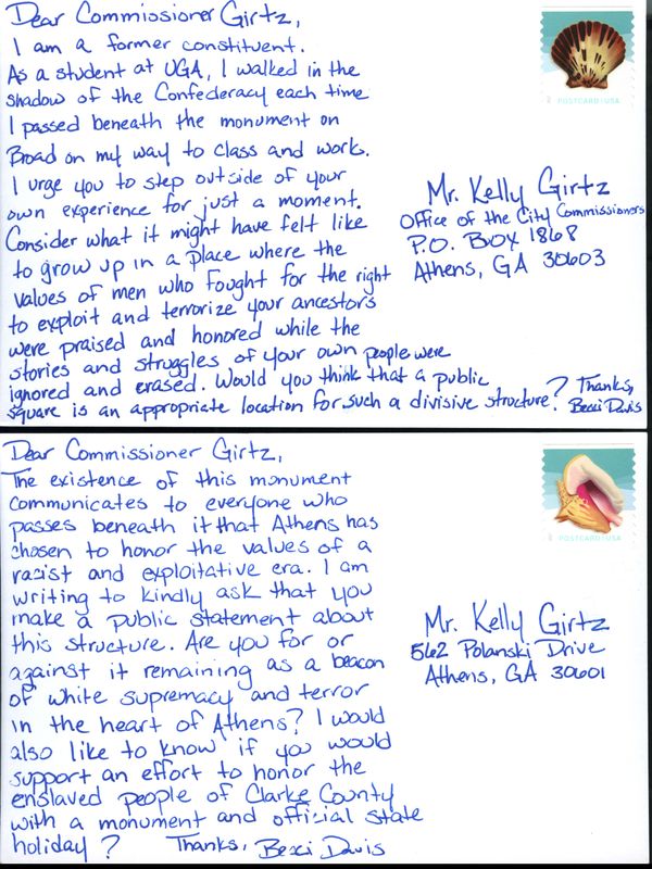 August 11, 2018 marked the first anniversary of the Unite the Right Rally in Charlottesville, Virginia. The gathering of white supremacists to protest the removal of the city’s Confederate monument and its horrific aftermath sparked a national conversation about these structures and their fate. Throughout my life, I have called several locations across Georgia home. Four of them are featured here; Athens, Augusta, Louisville, and Canton (Cherokee County), and Decatur. Each place is home to a Confederate monument in a highly conspicuous, public space. Two days before the Charlottesville anniversary, I left my current home in Wakefield, Rhode Island in order to travel to each city and confront its monument. By physically occupying each space to launch my own grassroots organizing, I seek to reclaim and transform it to honor my own ancestors and their communities rather than the men who fought to continue exploiting them.