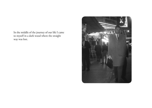 In this Dark Wood is an artist book functioning as a modern gothic. It pairs images of people walking alone in nighttime city streets with 90 different English translations collected of the first lines of Dante’s Inferno. The images, showing a crowd of solitary figures, are selected from the extraordinary Joseph Selle collection at the Visual Studies Workshop in Rochester, NY, which contains over a million negatives from a company of street photographers working in San Francisco from the 40’s to the 70’s. The book is set up in a repetitious way, to stress a sense of similarity, endlessness and interchangeability. The images are re-expressions of each other, and so are the texts.