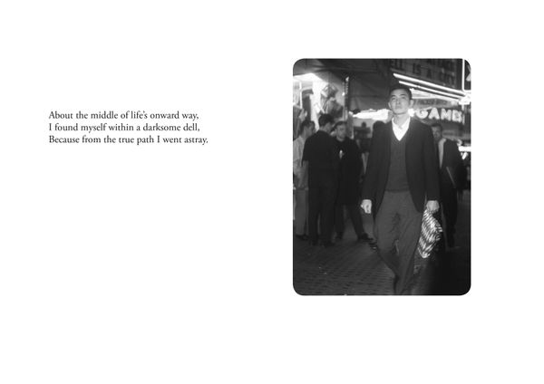 In this Dark Wood is an artist book functioning as a modern gothic. It pairs images of people walking alone in nighttime city streets with 90 different English translations collected of the first lines of Dante’s Inferno.
