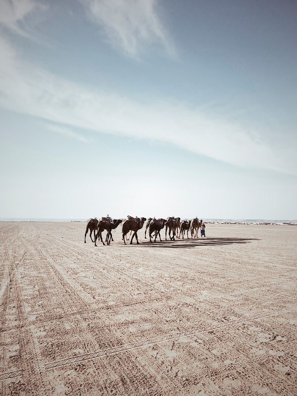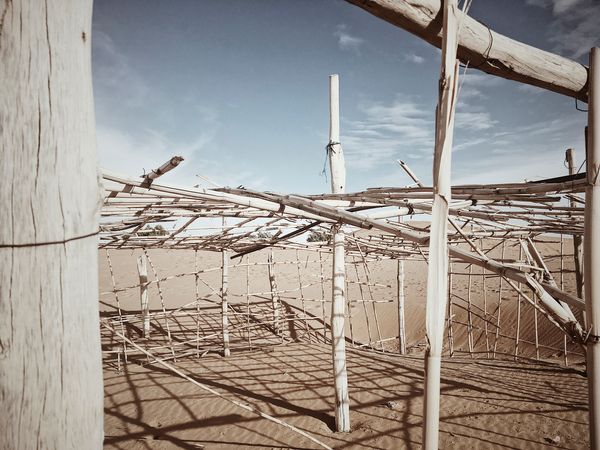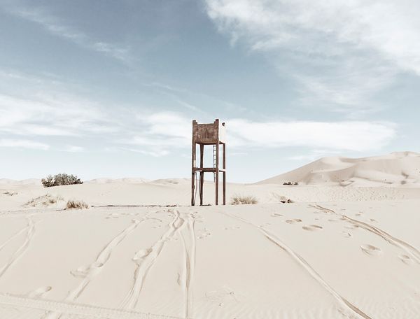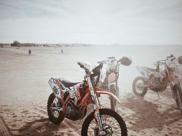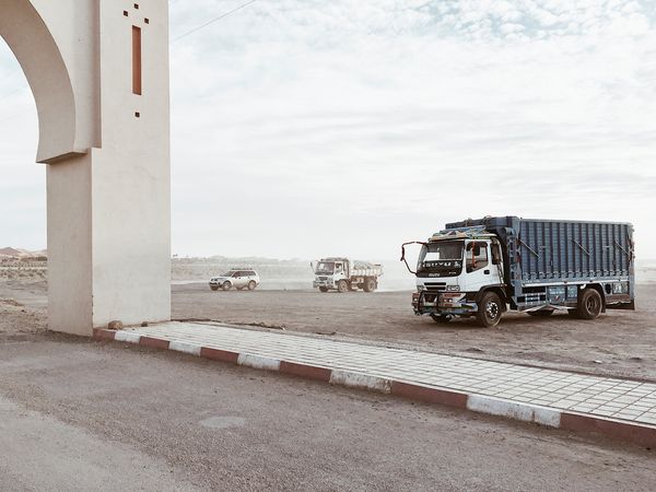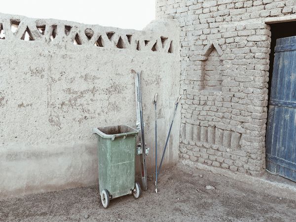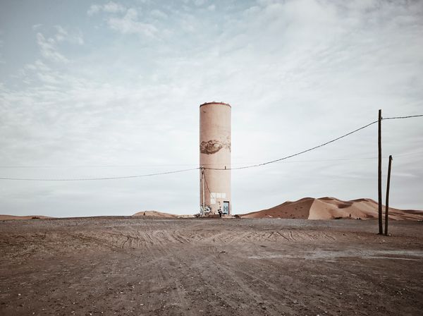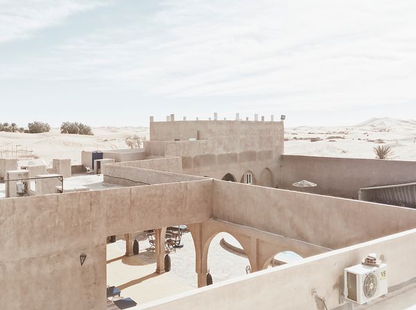 Merzouga, Morocco 11/2017. Last city before big dunes of Erg Chebbi considered the gate to Sahara desert in north Africa. Ten kilometers to Algerian state border. In summer it's a touristic and caotic place. In winter it's a ghost city, a symbolic place between human isolation and desert life.