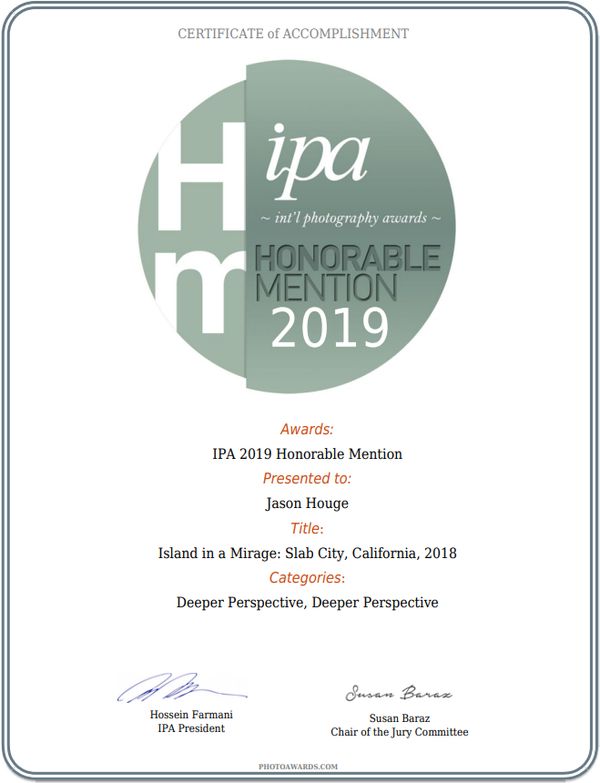 Slab City is a small ungoverned community in southern California. Residents struggle to survive in order to live without societal pressures and medical debt. This work comes from a place of personal understanding, love and empathy toward these social castaways.