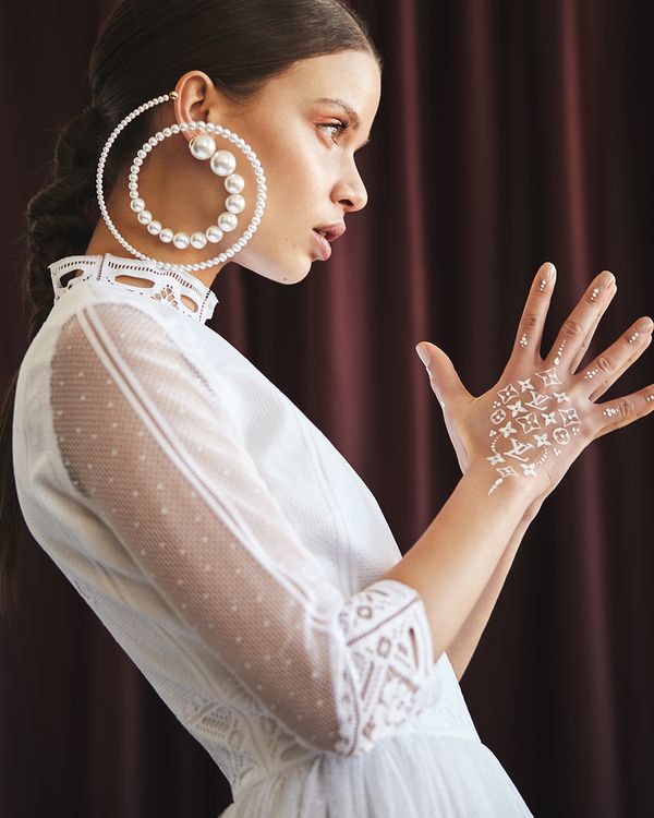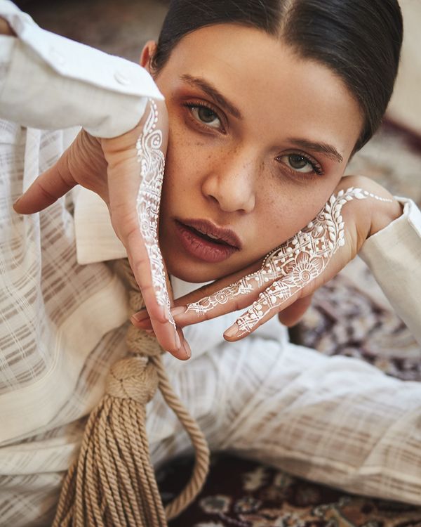 Model Stella Klein from M4 Models embodies the exotic look in a very special way. Her slightly dark complexion, bright eyes, and freckles underline the white henna by Linda Mey and the styling by Veronique Helmschrott. The orange-toned eye make-up by Anne-Marie Wittchen creates a bridge between the reds and the whites. Headpieces partly covering Stella's eyes are meant to alienate the whole story and underline the heaviness given by the dark curtains. At the same time, the model is posing lightly using the hands very much like she's forming mudras. She reminded me of "A Thousand and One Nights“ which is why I called the story „Jasmine“.