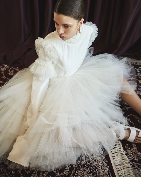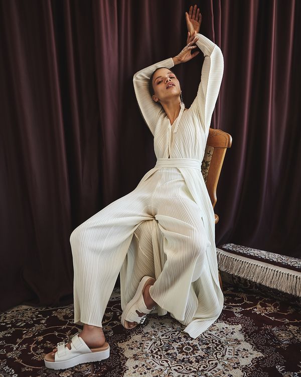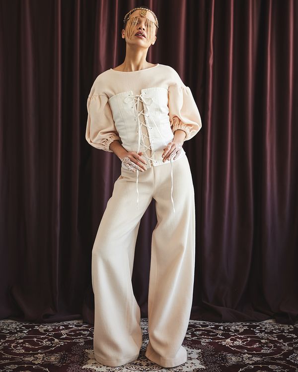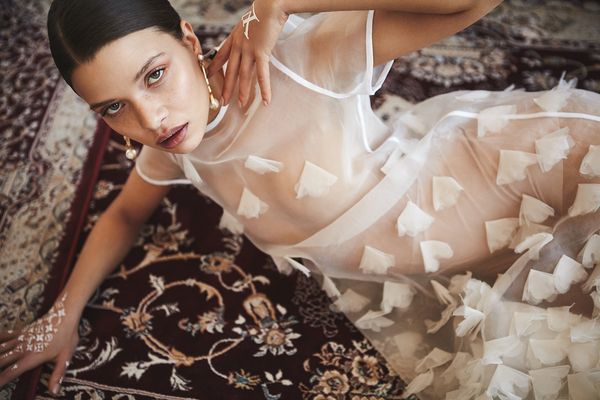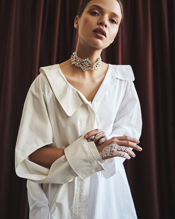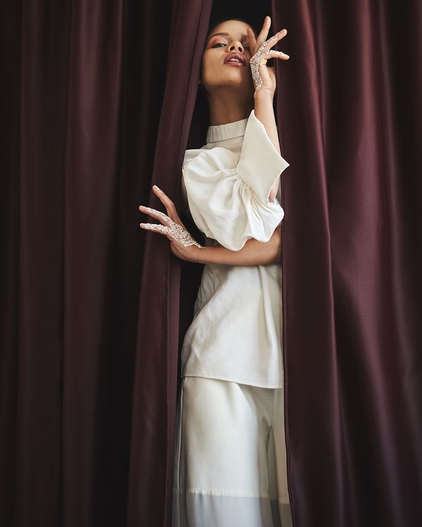 "Jasmine" is a fashion story that combines the heavy and the light. Bold red curtains are contrasting with bright fabrics, while detailed ornamental elements are getting broken by clean image designs.
