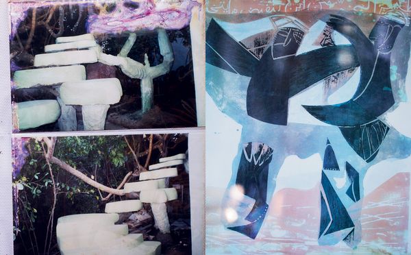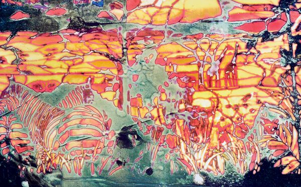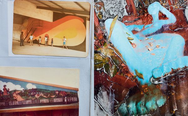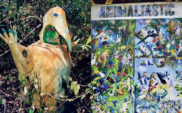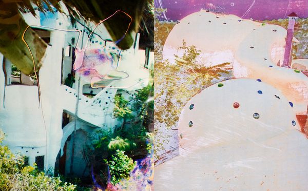 Jean-Vincent Simonet knows this story may only be told through fragments. He starts out in honest and literal fashion, meaning: we begin with the beginning, i.e at the entrance, glancing from the threshold, foreigners to this place. There’s a fairytale-like quality to the first image: the tip of a copper-colored castle pointing out of the forest, as both mirage and horizon; a pledge to intrigue. Steps are then furthered in symmetry, and symmetry comes back in hiccups throughout – as if to give a grammar to the hoarding chaos. Kitengela weaves a patchwork of paraphernalia and souvenirs. The project unfolds with a mirroring tempo: it collages interior with interior, serpentine floral shapes, front and back of an exhibition flyer, a series of shape-headed spoons following one another in portrait gallery-style. Our walkthrough goes crescendo, with a gradual surrender to the overload. We stumble upon posters, scrapbooks, a subscription to the East African Wild Life Society; Hundertwasser’s bleeding building; an alchemist’s dirtied nomenclature; a family album half-eaten by a gang of rats. Simonet digs through the mess, takes pictures of pictures, duplicates to the point where authorship dissolves into magmatic effects. He draws an equivalence between the stain-glass walls and the surface of the page. Increasingly scratched out, covered in cracks, the photographic imprint pulls towards abstraction. Images bear the marks of wear and tear; they’re blinded by light, oxidized by rain or plastic. Some have stared at the sun for a little too long.