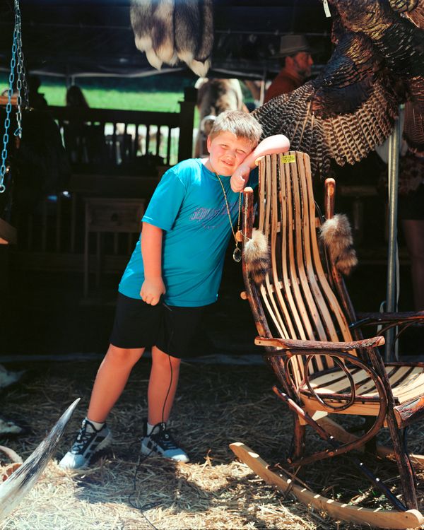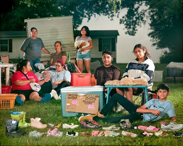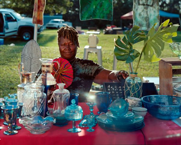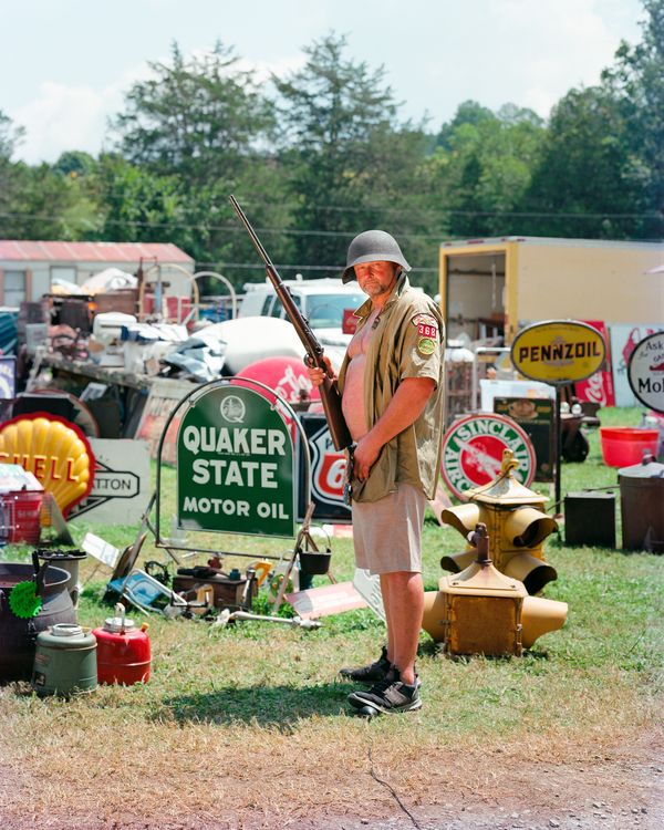 In the summer of 2024, as the country braced for another contentious presidential election, I traveled this route with a large-format 4x5 film camera. I composed the images and then handed the shutter release bulb to my subjects, allowing them to take their own portraits. The result is a collective self-portrait of the yard sale—an intersection of survival, nostalgia, and identity.
