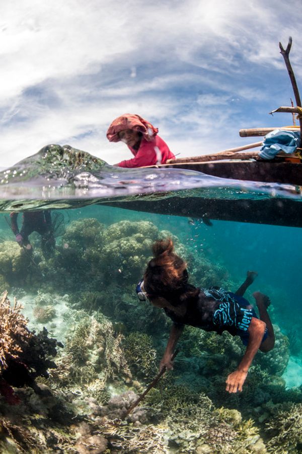 Of all these communities, the Bajau Laut have perhaps suffered the most. The Bajau Laut are some of the last true marine nomads. An ethnic group of Malay origin, they have for centuries lived out their lives almost entirely at sea, plying a tract of ocean between Malaysia, the Philippines and Indonesia. In the last few decades, many have been forced to settle permanently on land, but a dwindling number still call the ocean home, living on long boats known as lepa lepa. Traditionally, they fish with nets and lines and are expert free divers, going to improbable depths in search of pearls and sea cucumbers or to hunt with handmade spear guns.