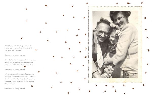 Alongside the materials from my family’s personal archives and my own photographs, I include preserved flora, which has a few meanings. First and foremost, the preserved flowers symbolizes the family history I am preserving by telling this story. Pressing flowers within the pages of books is also a practice that many of the women in my family have done throughout the years; it was an art project my mom used to do with me when I was little. But more than that, pressing flowers is a craft that expands far beyond my family. Many people press flowers, and thus it's a practice they can connect with, similar to my story, which descendants of Holocaust survivors and the survivors of other genocides can relate to.