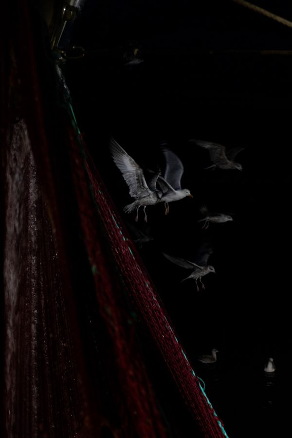 The darkness barely outlines the silhouettes of the boats, making them almost invisible.