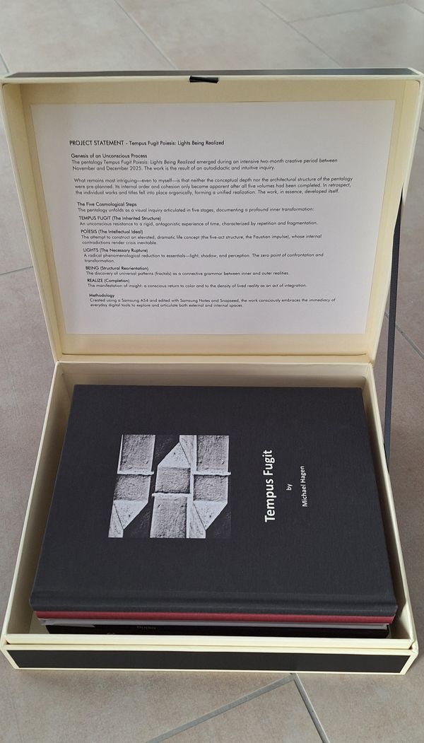 The pentalogy Tempus Fugit Poiesis: Lights Being Realized emerged during an intensive two-month creative period between November and December 2025. The work is the result of an autodidactic and intuitive inquiry.