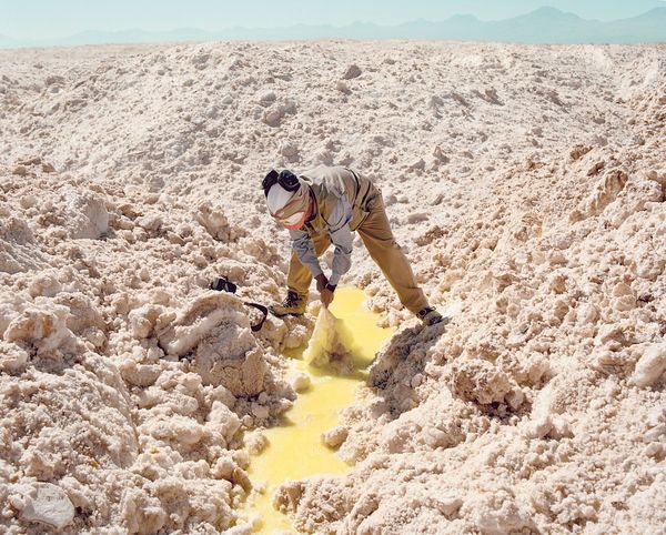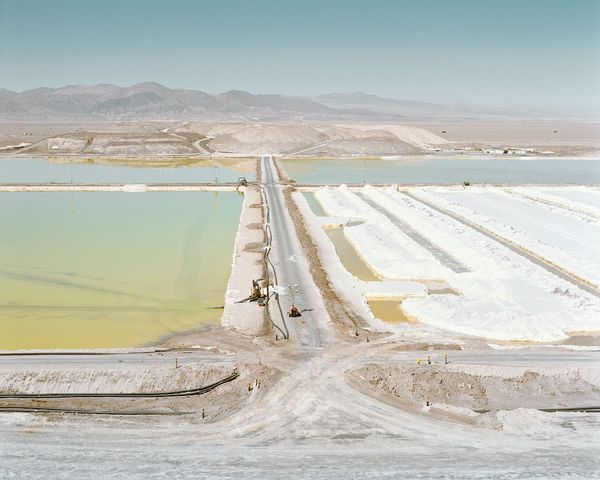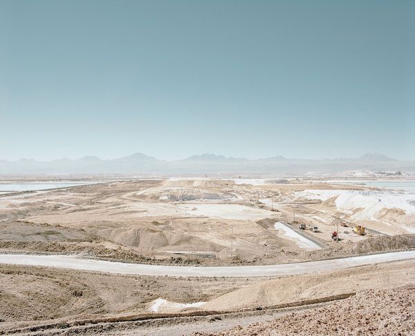 Such is the picture in Catherine Hyland’s series of images from the SQM mine in the Atacama desert in northern Chile. The Atacama is famous for being the world’s driest place. Four thousand metres above sea level in the rain shadow of the Andes Mountains, almost no rain falls here and the people who do live here have historically scraped a living breeding llamas and goats or knitting hats. So it’s remote and isolated. It’s also the world’s largest source of lithium, home to minerals that provide the power that fuels our modern daily life. Break down a smartphone battery and you’ll find 3 grammes of lithium in there. A lap top has around seventy grammes. Move up to an electric car and you’ll find twenty kilogrammes. Lithium is the element of the moment and the Atacama is where most of it comes from.