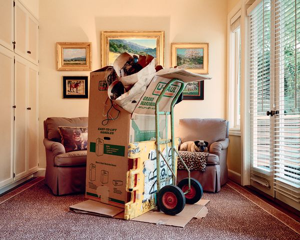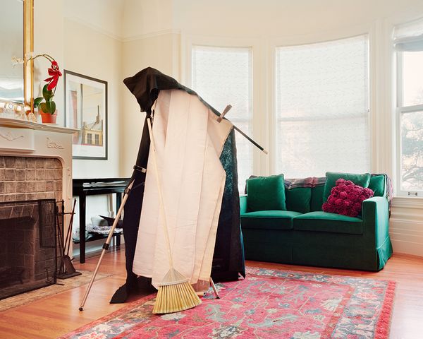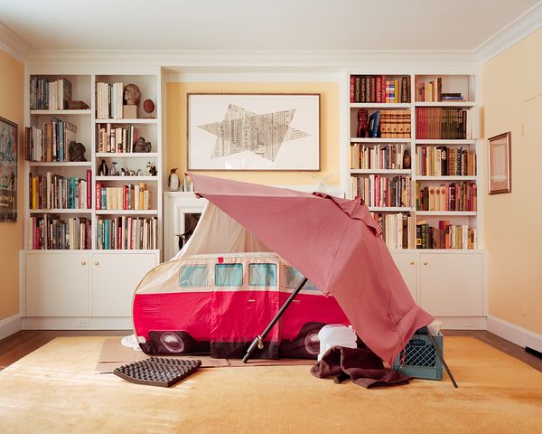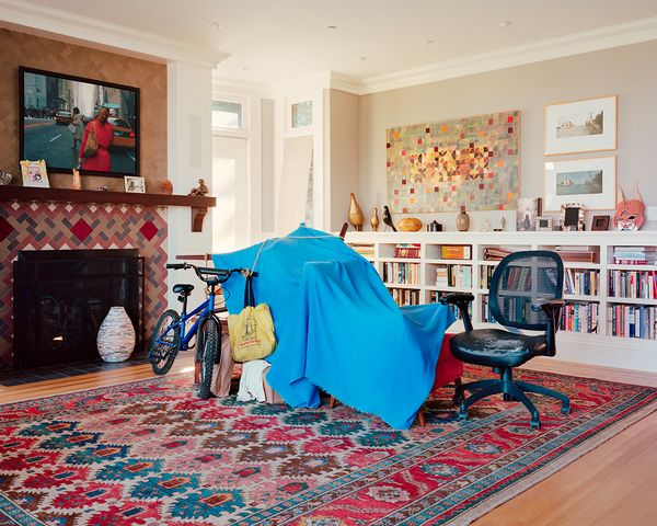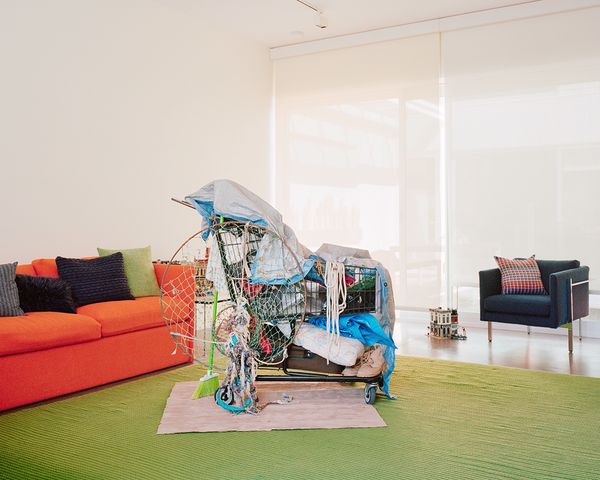 The photographs from the project Living Room document a series of temporary homeless shelters erected in various wealthy living rooms in San Francisco using materials found on the streets.