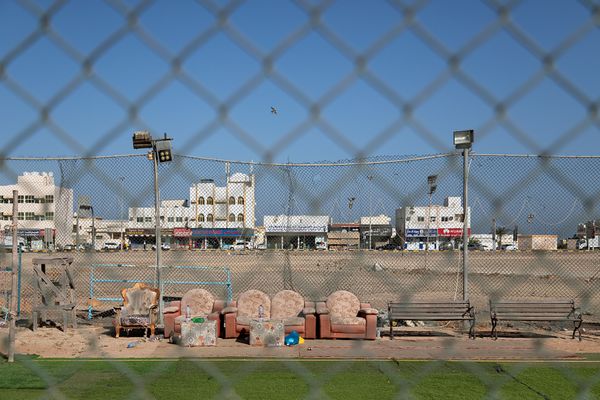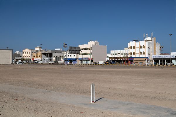 Often constructed with materials that were to hand - a notable exception being the Khor Fakkan ground which was an altogether more sophisticated affair - the makeshift pitches were laid down using astroturf, poorly laid concrete, compacted sand or abandoned car park surfaces, with stumps made from concrete blocks, bricks, plastic bottles or whatever functioning materials were available and of significant weight to keep them upright. Male-only detritus fell just outside the edge of the pitch - electrical tape, cigarette ends, massage cards, laban up cartons and chai cups, sometimes neatly bagged up and discarded, oftentimes not.