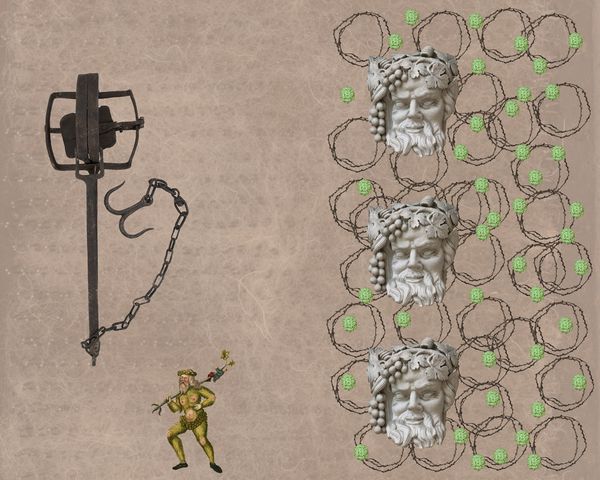 These images are stylised photomontages depicting artefacts of peasant life, shown alongside representations of rural traditions, and objects relating to contemporary land struggles. The montages are exhibited with Gordon’s large-scale photographic portraits of UK folk traditions to show how these, often ancient, rituals have performed the boundaries, histories, and customs that mark our relationship to the land.