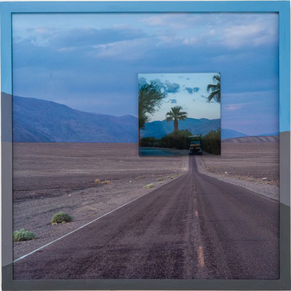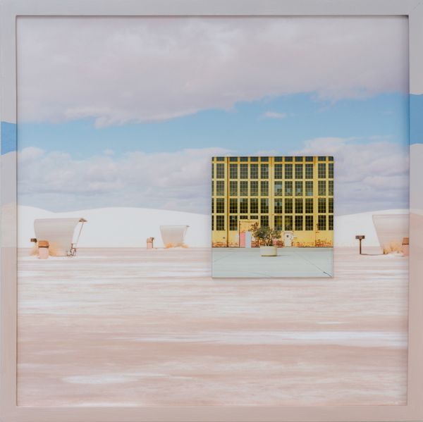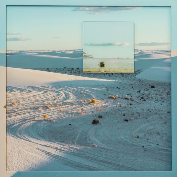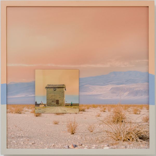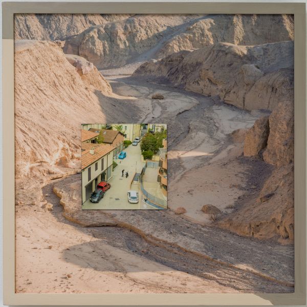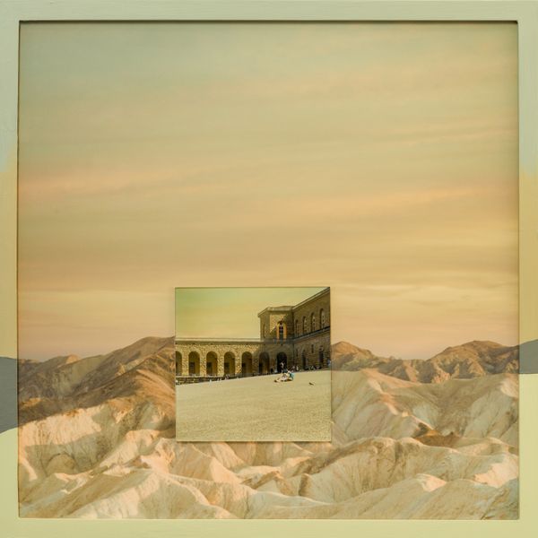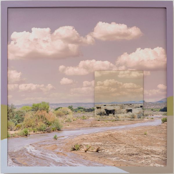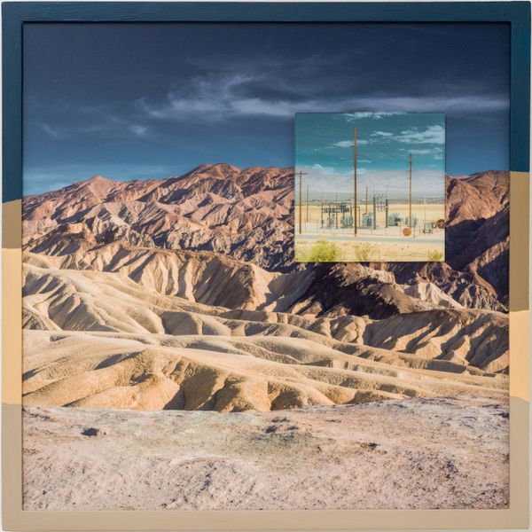 I have mounted scenes of human habitation behind acrylic, plastic walls that we imagine can safely separate the things we do from having an impact on the natural world. I have then affixed these scenes onto and within sweeping landscapes. I am presenting this work without glass. The constructed world behind the acrylic is literally protected, while the landscapes remain exposed and vulnerable. A continuity of line and color between these two parts of the work hints at their interconnectedness. I use the desert southwest of the United States as a stand-in for what the majority of the land on our planet might look like as it continues to be shaped by rising temperatures, drought, and fires. I present these multi-layered images in hand-painted wooden frames, alluding to the next chapter in the planet's history. As the image pushes beyond its edges, the story continues to evolve.