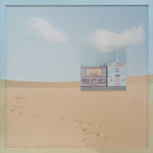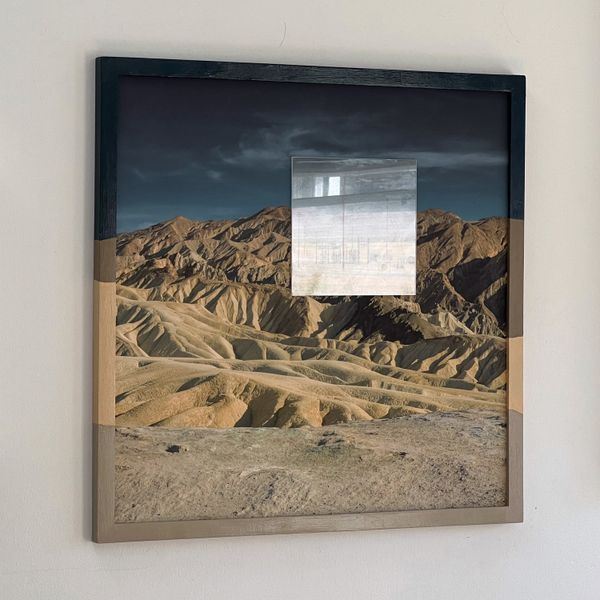 I have mounted scenes of human habitation behind acrylic, those plastic walls that we imagine can safely separate the things we do from having an impact on the natural world. I have then affixed these scenes onto and within sweeping landscapes. I am presenting this work without glass. The constructed world behind the acrylic is literally protected, while the landscapes remain exposed and vulnerable. A continuity of line and color between these two parts of the work hints at their interconnectedness. I use the desert southwest of the United States as a stand-in for what the majority of the land on our planet might look like as it continues to be shaped by rising temperatures, drought, and fires. Ultimately, I present these multi-layered images in hand-painted wooden frames, alluding to the next chapter in the planet's history. As the image pushes beyond its edges, the story continues to evolve.