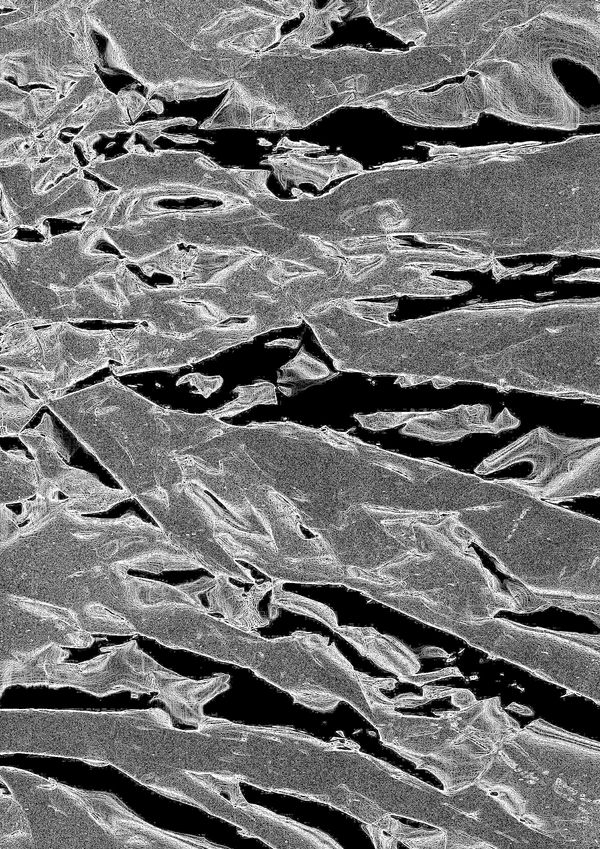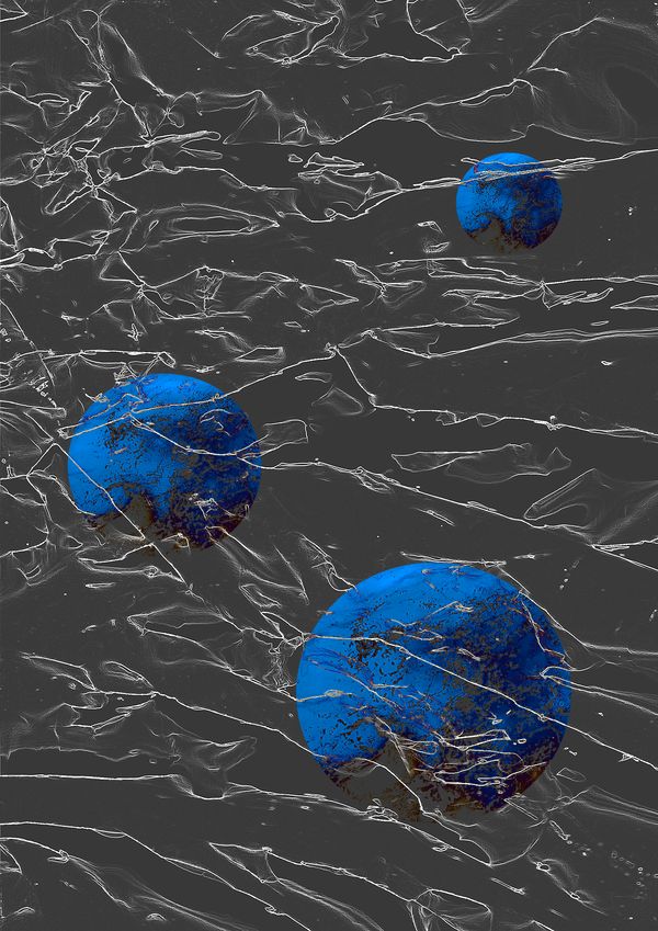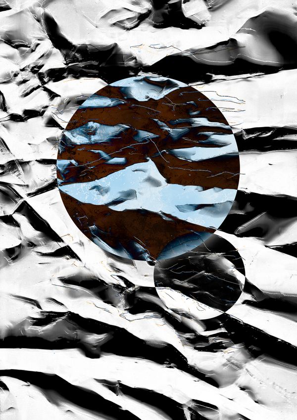 The Nature Energy Technology series uses similar methods to the Lombardy Series, but this time I use silver and gold foil as a starting point to create sculptural pieces. These are then scanned, digitally enhanced to clearly reveal the topography and act as a background for the final artwork. Strips or circles are cut from the printed pieces (or before scanning) and moved around sometimes manually and sometimes digitally in the artwork. This movement or displacement of the original landscape responds to the severity of interaction of technology with our natural environment. The cut pieces are moveable, disposable, and therefore reflect the fragility of our environment but also a way for the displacement to be reversed. Natural elements, such as water or dissolved soil are added in at different stages, either photographed and added in digitally or added to the scanner before photographing. (Inception 0)