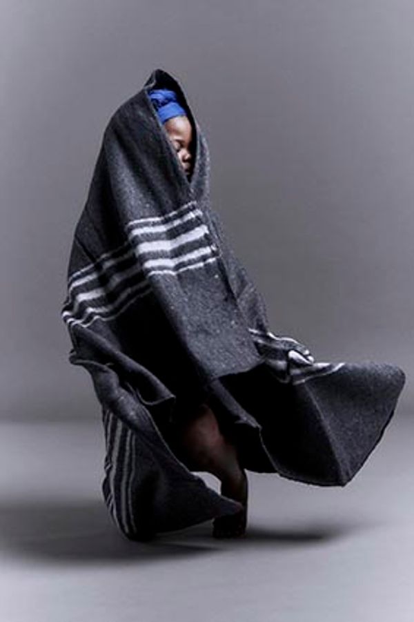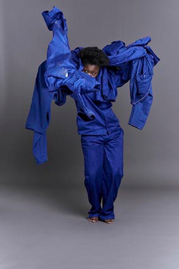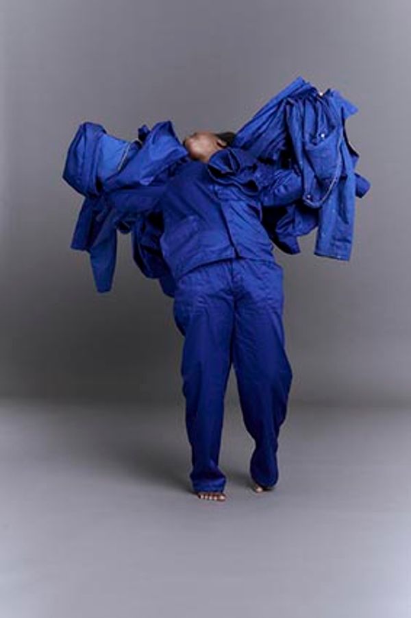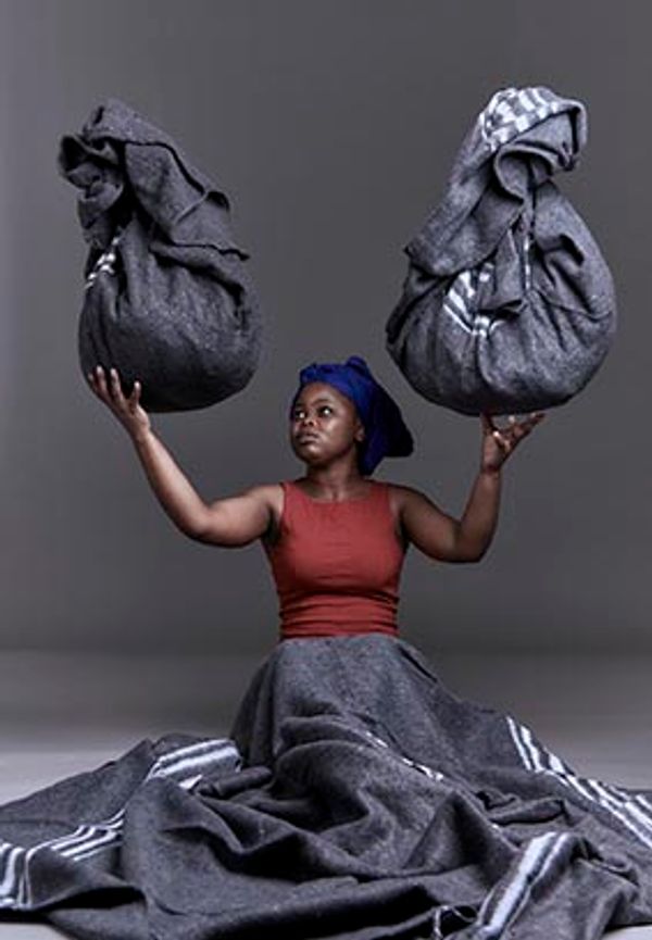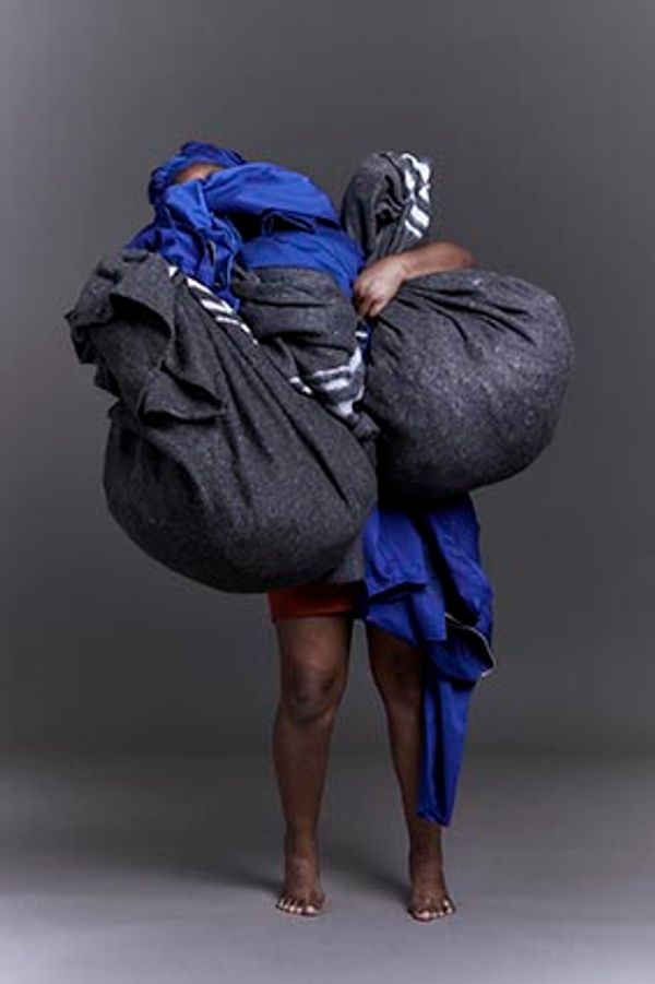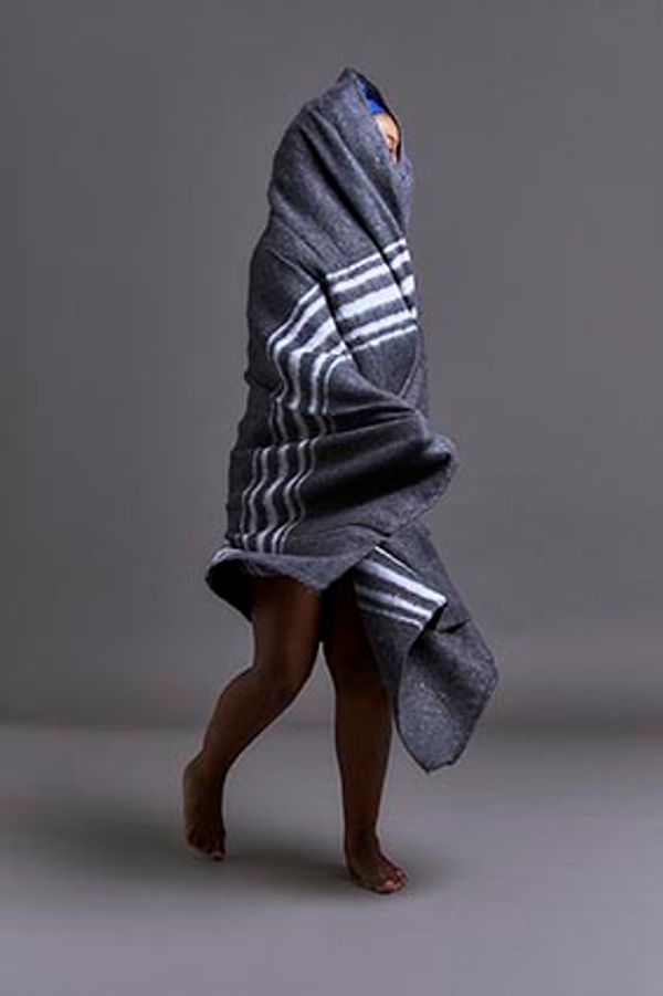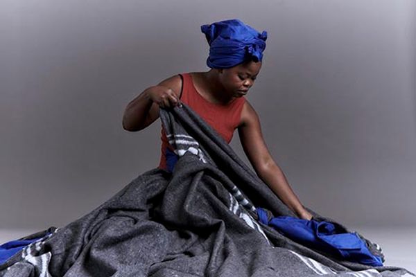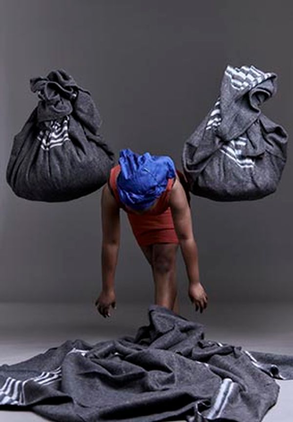 The workers' overalls and blankets (used in poor communities) tell the story of many South Africans - defined by their role in the working class. Much like the bags in 'Umaskhenkethe Likhaya Lam', the overalls and blankets represent the impermanence of home space, and the search to find comfort in the familiar: to carry a part 'home' with you, and to come to grips with the burden of its weight. Continuing the conversation on migrancy, Nqaba physically confronts and challenges (the value of) the materials, which in turn take on their own agency.