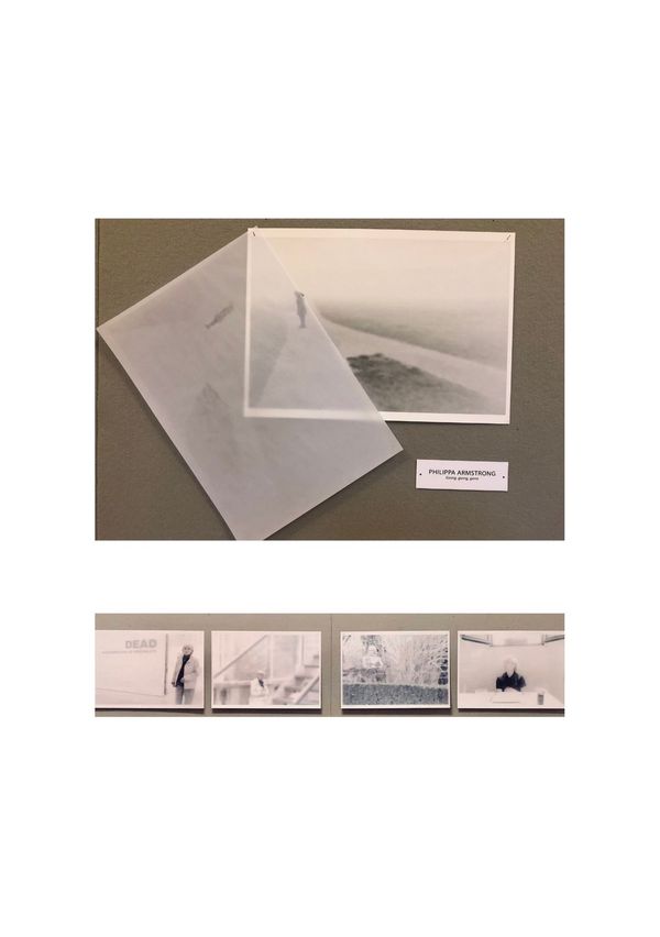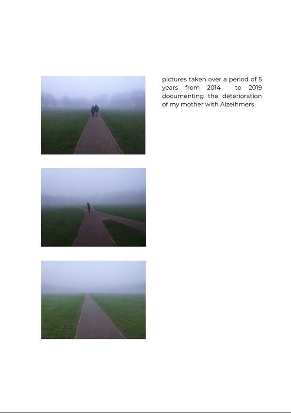 Pamela is my mother and she has alzeihmers .her memory started fading 10 years ago.now we her loved ones are shadows .she looks at us with vacant eyes.her last whole sentence to me was " are you looking for a friend too?",while waiting for the boat to take us across the Thames .the photos were taken in different moments of pamela in isolation or disorientation. They are printed on photografic paper and tracing paper with faded colours .the tracing paper sits on the photo paper creating a foggy effect just like a vague memory .if lifted or blown the image underneath is clearer