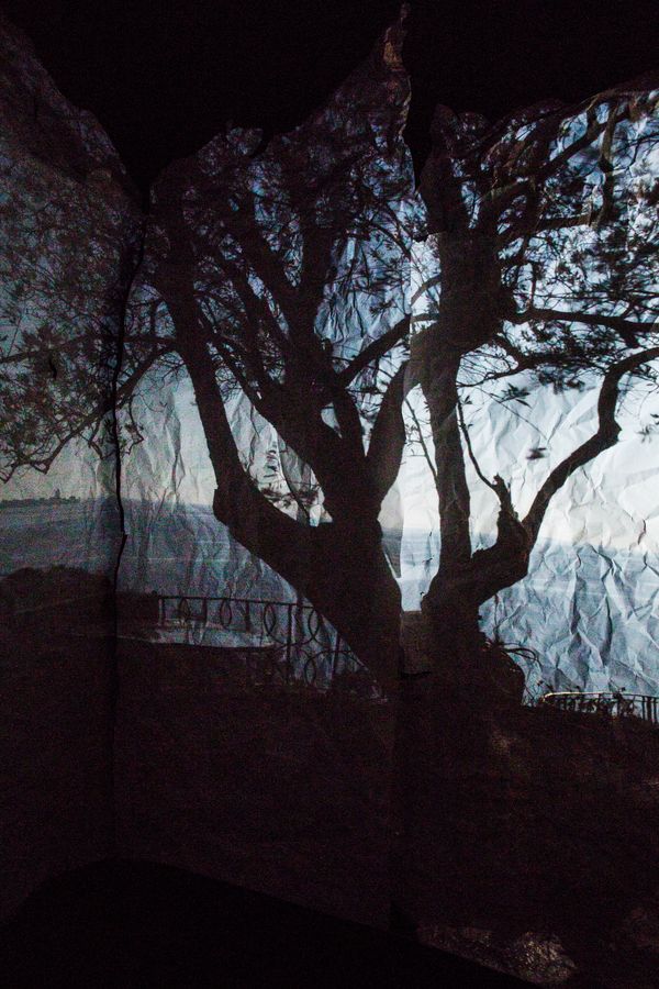 It projects onto a screen she has hung there, great sheets of crumpled white paper, in places mended and torn. They hang like bed-sheets on the laundry lines of her childhood, giving texture to the wash of pinhole light.