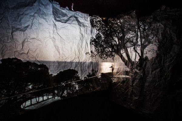 All that is visible to you is shadow play: broad shapes in black on white. Slowly, however, your eye begins to make sense of things. You see branches, then twigs and leaves, and lines that might be railings, but still you feel disoriented; you cannot see where you stand. At the same time, the soft white wash is changing. It becomes grey with a silver sheen in it before you realise that in one corner the sheen is moving – and suddenly your mind lurches and you being to see. Before you, upside down and caught by the hanging sheeting, sprawls the vast, breeze-rippled Mediterranean. There’s that rock-island in the sea beyond the trees and the railings, an ashtray someone has left on a concrete pillar, the water twinkling in the afternoon sun.