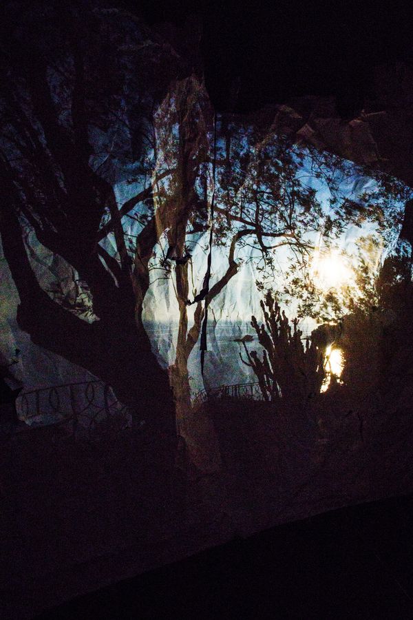 Peretti cobbled together her camera obscura from found objects that she pulled together in a summer chalet at the bottom of a garden, on a coastline ragged with subsidence on the edge of the Mediterranean sea. She used black plastic bags and cellotape, pieces of cardboard and sheets of paper recycled by a local business in the village where she happened to be working, on Italy’s Ligurian coast.