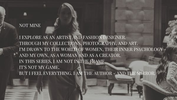 NOT MINE I EXPLORE AS AN ARTIST AND FASHION DESIGNER. THROUGH MY COLLECTIONS, PHOTOGRAPHY, AND ART. I'M DRAWN TO THE WORLD OF WOMEN, THEIR INNER PSYCHOLOGY - AND MY OWN, AS A WOMAN AND AS A CREATOR. IN THIS SERIES, I AM NOT IN THE FRAME. IT'S NOT MY GAME.
