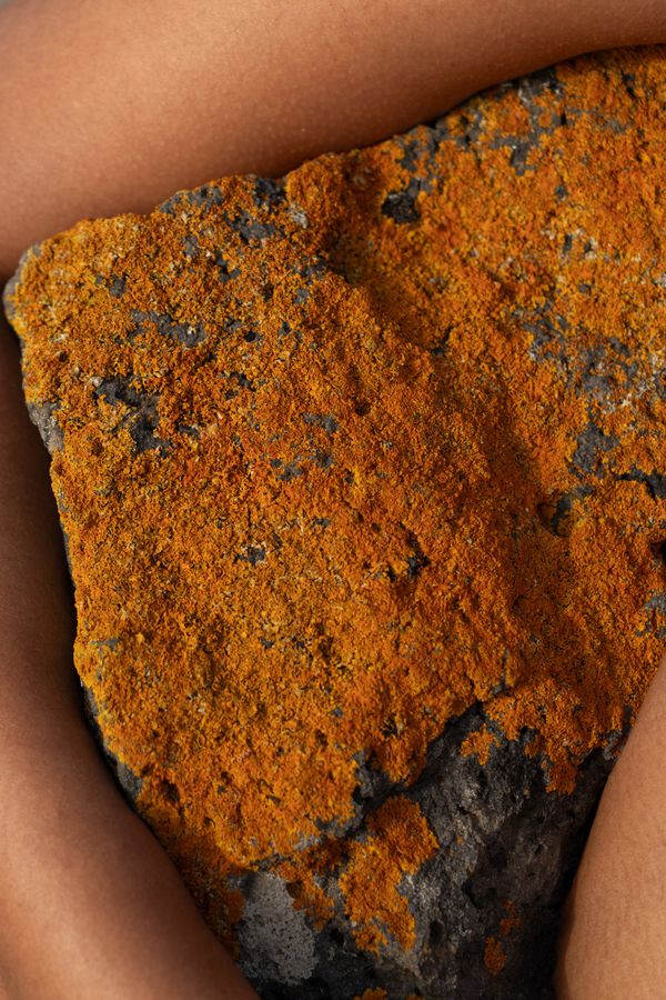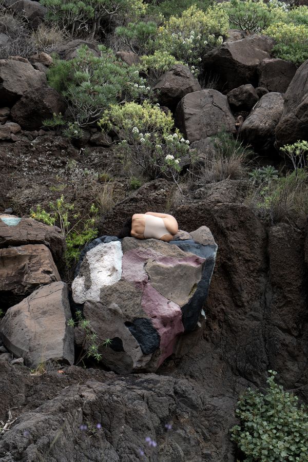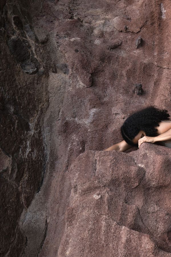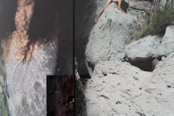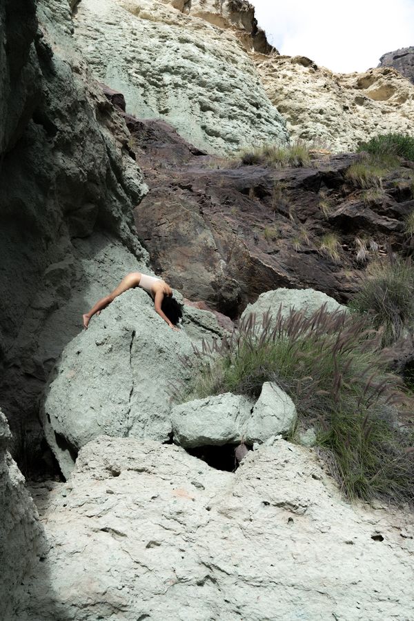 Amidst all of this stands a woman who seems to have a unique relationship with her surroundings—one distinct from that of travelers. She swims just beneath the surface, the water’s reflection tracing circles on her skin, which are mirrored in the rocks. At another moment, she lies on a sand dune, as if swept there by the wind, or curls up on a large stone.