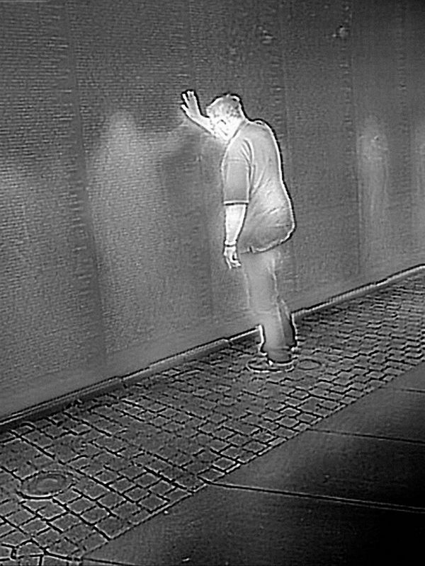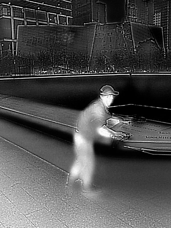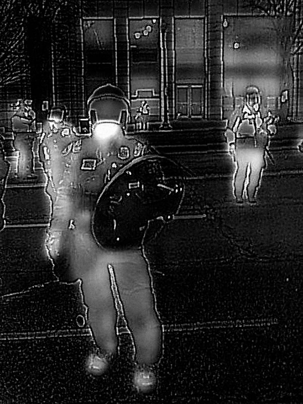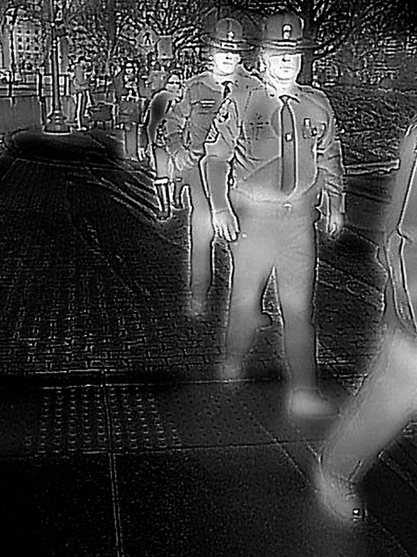 In 2014, a low-resolution thermal-imaging camera was introduced for sale as a clip-on accessory for smartphones, part of a growing commercial market for infrared technology. I was curious to see how this technology designed for surveillance renders the human form, and thereby better understand how citizens appear when viewed by government security forces. I began photographing areas of heightened security around the United States, including New York City, Washington, and anti-government protests.