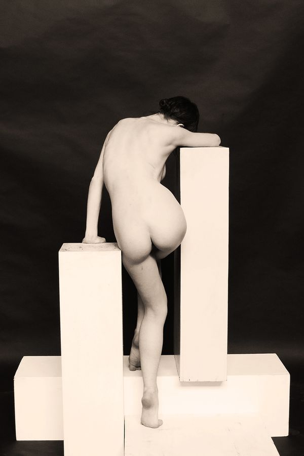 In this series, the pedestal serves as a prop or props to which the model must adapt, sit recline and stand within. Each image records the specific pose a model chooses to interact with the pedestals. In doing so there is much adjustment and thought with positioning of the objects,