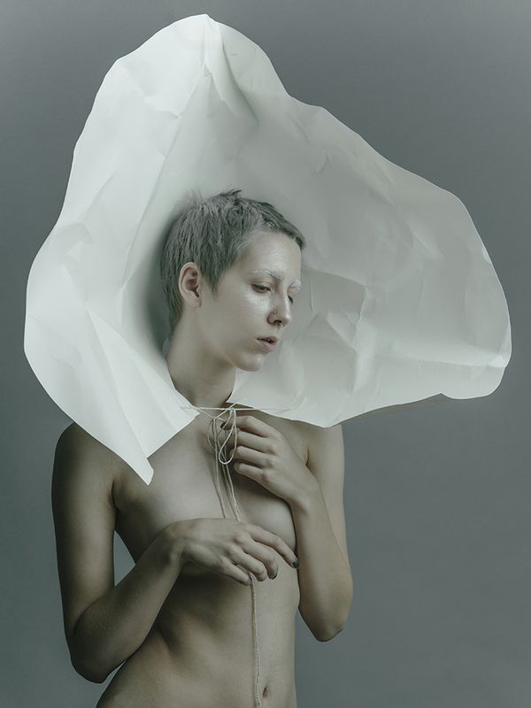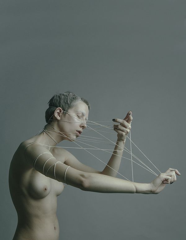 Pezdek’s images are allegorical expressions of specific and unusual phobias such as the fear of paper and the fear of being tied up. She creates a voyeuristic quality of witnessing someone’s deepest fears which are tangibly exposed in contorted postures and literally overtaken by objects. Distilled down to their essence, these phobias are not simply the insane products of one person’s bizarre imagination; more profoundly, they represent a perverseness universal to humankind, primal fear.