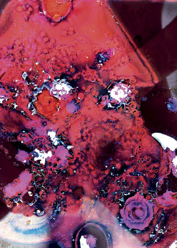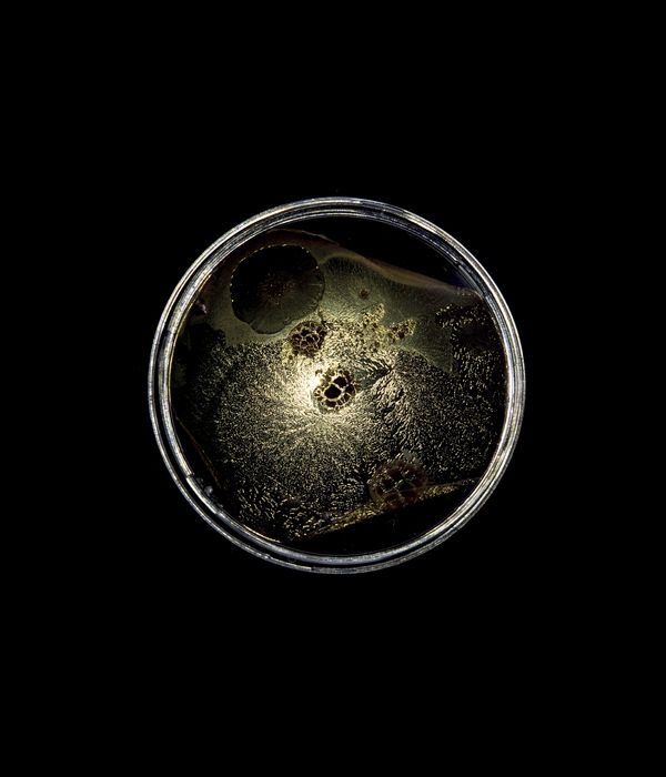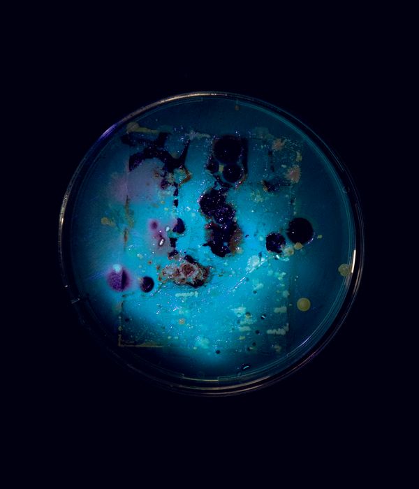 The project Planet Agar Agar tells the story of a celestial body discovered during an interstellar journey. A planet covered with mold and fungi, continuously evolving life forms. The narrative alternates imagination and reality, microscopic and macroscopic, intertwining biology and photography. The objective is direct: to deconstruct the photographic image, leaving only traces of pictures, like a lost novel broken into fragments. These signs release the observers from the need of understanding what is real and what is not, therefore allowing them to roam free on the obscure ground of the planet; a field where document and imagination, pixel and pigment, biology and technology are fused together. The action of time is fundamental – the time of traveling, the cultivation of bacteria, the slow destruction of the photographic picture, and the collection of these images. Eventually, Agar Agar becomes the land where bacteria win over animal life.