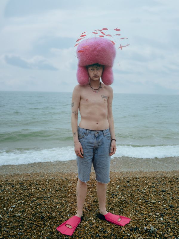 Other parts of the characters are heavily influenced by the models. While working with Zebedee Talent Agency, an agency that represents people with disabilities and visual differences, we had an opportunity to include the most unique and beautiful people who made this project even more special and authentic to its message. The scenes are a blend of surrealism and reality - Hannah is dressed in an outfit resembling an armchair, positioned in front of a large mansion, while also holding her own wig and cane. Myah is wearing their own design and placed at the iconic London neighborhood "The Barbican", their design is inspired by the conflict between their religious upbringing and their queer identity. Meanwhile, Diogo is portrayed in his drag character, 'Co Kendra,' captured in his own home.