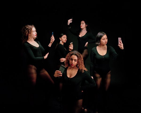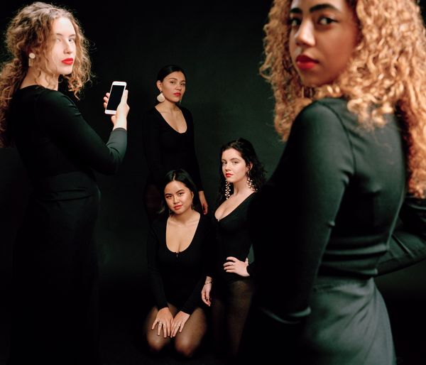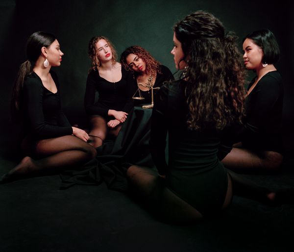 The third chapter sees the girls manoeuvre through the digital age. Time being spent being disconnected from one another. The black represents the vastness of the digital space and social media platforms, almost like a black hole. The dolled faces, almost like a mask, is juxtaposed with their outfits, stripped down raw, representing the vulnerability of the girls. The scales represent the balance between irreality and reality. It explores the challenges girls face growing up in this social media driven world where we create a false persona for everyone to see.