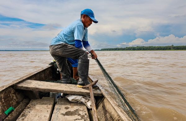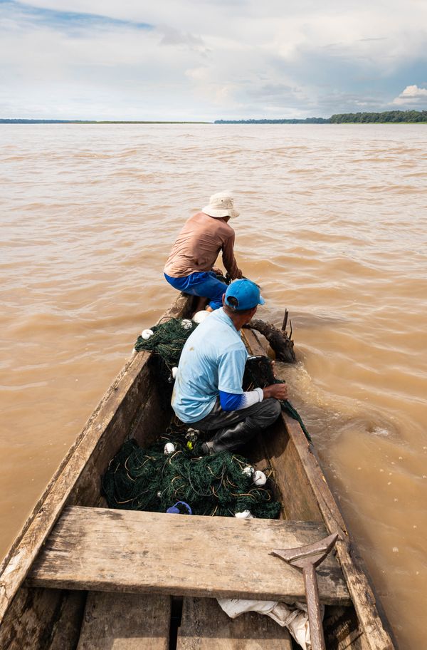 Beneath a blue but shifting sky on the Amazon River, Joaquín and a fellow fisherman repeat a choreography shaped by strength and current. What appears effortless — almost meditative — from a distance reveals itself, up close, as an exhausting negotiation with the river. Nets are cast, pulled, untangled, and cast again — a rhythm defined by repetition, endurance, and strength.