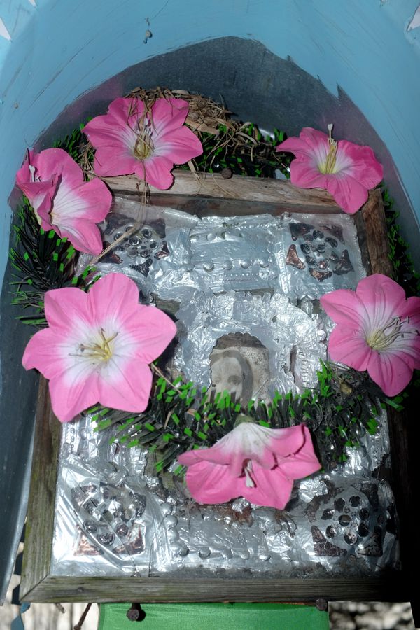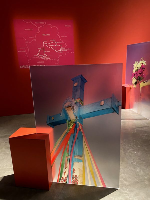 In today’s fraught political climate, studying Belarusian ethnography and culture has become increasingly complex. Contemporary researchers are forced to rely on the knowledge of 40-50 years ago, without understanding whether and how the rituals have been preserved and transformed. They are forced to rely on the subjective narratives of ethnographers (more often men) as well as black and white photographs. That is why, for her research, Pcholka created three maps, marking all the points (villages) where the photos were taken for Romaniuk's book. And she conducted three expeditions in search of the wooden crosses documented in the book. Ultimately, she could not find any crosses depicted in the book. The crosses most likely disappeared through natural means, or to make way for updated versions. Indeed, many were replaced by new ones, most often metal, decorated by local people, reflecting their individual knowledge and aesthetic preferences. The eclectic appearance, with its use of contemporary detail, influenced Pcholka’s choice of a contemporary photographic language to document these objects.