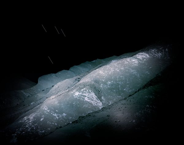 Mirroring expeditions to observe or hunt animals in the wild, this project is the geological equivalent of going on safari. Traversing remote locations in off-roading vehicles, large format camera system in tow, while scanning the landscape with a tactical flashlight, this methodology is reminiscent of catching an animal's eyeshine in the dark. In ROCK SAFARI, the rocks themselves act as giant tapeta lucida, the layer of tissue in the eyes of nocturnal animals which reflects light back through the retina and creates the eye “shining” effect in the night.