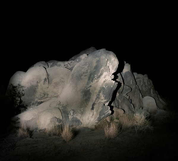 ROCK SAFARI is a large format analog study of rock outcroppings illuminated by a high-powered, long-range hunting flashlight. Nestled in various locations of the Mojave Desert, these formations are slowly and selectively painted with light during exposures on 4x5 color negative that range from eight to forty-five minutes. This process is both a mediation on rare sightings of ancient geological treasures, as well as an ephemeral, time-based performance, rendering no two exposures alike.
