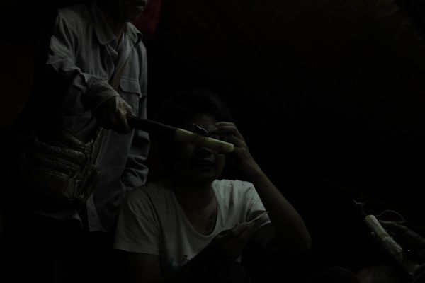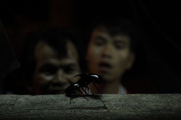 Placed on top of a hollowed out log, two shiny rhinoceros beetles are facing each other. Enticed by the scent of a female trapped inside the log and goaded by the sound of a small stick rubbing on the wooden branch, they use the horns on their foreheads to push and pull each other. At times, one combatant will manage to lift the other up into the air and, if lucky, succeed in driving it off the branch. The winner will be rewarded with sugarcane and sap but its desire to mate with the female will not be met. The duels are closely observed by each teams’ supporters, leading, by turns, to open mouths, gasping and yelling, cries of disappointment and boisterous jubilations.